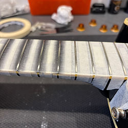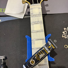 Denna fina Burny RLC-60 från 1983 fick sig en rejäl rekond! Vi börjar med att ta av och försiktigt tvätta och göra rent hårdvaran som sitter på, speciellt med tanke på hur gammal denna gitarr har hunnit bli. Vi tar som vanligt alla mått av befintlig setup för att kunna spara och återställa den som den var när den kom till GuitarCare. Därefter tejpas greppbrädan av för att skydda vid en polering av fretsen. Det är väldigt låga frets på denna och har till och med kvar sin fret edge binding på halsen som den kom med, vilket är väldigt ovanligt och påvisar att fretsen med största sannolikhet fortfarande är original. När poleringen är klar torkar vi av rester av poleringsmedlet och smuts från gitarren och börjar tvätta och olja in träet på greppbrädan. Vilken fin mörk nyans av greppbrädan som tittar fram när vi lägger på oljan och låter det verka ett tag! Kunden önskade att vi sätter på ett par guldiga kåpor på gitarrens mikrofoner för att få till en annan look vilket vi gärna hjälper till med. Vi föreslog för kunden att vi kan göra en lättare "relic" av kåporna för att bättre matcha med den övriga guldiga hårdvaran på gitarren som har åldrats under en längre tid, vilket vi gjorde. Vi gjorde lite underhåll på elektroniken som behövde lite assistans för att fungera bra igen och bytte ut saker som glappade, bland annat input uttaget mot ett nytt. Kunden önskade även att byta pottskruvarna som denne hade med sig till GuitarCare. Stay tuned för detta är del 1 av 2 av denna gitarr som ni kommer se mer av framöver i uppkommande projekt!!