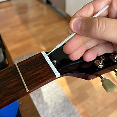 Denna Gibson SG Special har fått stå framme sedan den köptes ny 2011 utan någon tidigare vård så den var i stort behov av en rekonditionering och ett strängbyte. Vi började som vi alltid gör med att testa så att allt som ska fungera på gitarren fungerar och tar sedan och monterar av all hårdvara. Därefter gjorde vi en polering av fretsen på greppbrädan som bilderna visar, vilket ger en otrolig skillnad på känslan och snabbheten när man spelar på den efteråt. När det var klart rengörs greppbrädan och oljas sedan in med "Lemon oil" så att träet återfuktas av oljan som får verka en stund innan överflödig olja torkas bort. Till slut tvättas resterande gitarr och görs ren för att sedan montera tillbaka all hårdvara igen. Vi lägger även på lite smörjmedel på nuten och stallets skåror där strängen ligger mot. Det ger mindre friktion och nötning av strängarna när man spelar och gör att de håller lite längre. Denna gitarr fick ett par nya 11-42 strängar på sig och avslutningsvis testar vi så att gitarren fungerar som den ska innan ägaren får tillbaka den igen. Ägaren av denna gitarr var väldigt nöjd och har flera gitarrer framöver som GuitarCare kommer hjälpa till att fixa ordning.