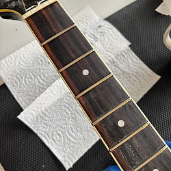Denna coola Ibanez AR-50 från Japan har många år på nacken och sett många speltimmar vilket gör att den behöver fixas iordning. Kunden vill att GuitarCare kollar igenom elektroniken i gitarren så allt fungerar som det ska, att en rekond görs på den samt att nya strängar ska monteras. Först skruvade vi av all hårdvara på gitarren och snyggar till allt med rengöringsmedel. Vi använde en fretboard protector som skyddar greppbrädan när man polerar fretsen och slapp tejpa manuellt. Därefter rengjordes greppbrädan som var extremt smutsig och torr efter många års rockande. Greppbrädan återfuktades med olja och gitarrens alla sidor tvättades rent med produkter från MusicNomad. Volympottarna sprakade när man spelade på gitarren och detta fixades till med rengöring av pottarna samt elektronikspray vilket gjorde susen! Kunden önskade helst att slippa byta ut och behålla originaldelar på gitarren så långt det går vilket vi lyckades göra denna gång. Härligt! Nya strängar från Ernieball sattes på och vi lägger på en dutt med "Tune-it" från MusicNomad som gör att strängarna smörjs in där de kommer i kontakt med gitarren för att förlänga livslängden på dem och spela bättre. Till sist lägger vi på lite smörjmedel från D'Addario på strängarna även fast de är nya, så de blir rena, insmorda och spelar som de ska.