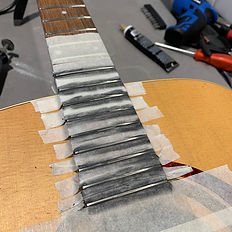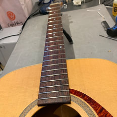 Vi genomförde en rekonditionering av denna akustiska gitarr som innehöll tvätt av kropp, hals och huvud. Greppbrädan tvättades rent och oljades därefter in och fretsen polerades så de blev som nya igen. Stämskruvarna fick sig en rengöring och nya strängar sattes på gitarren.